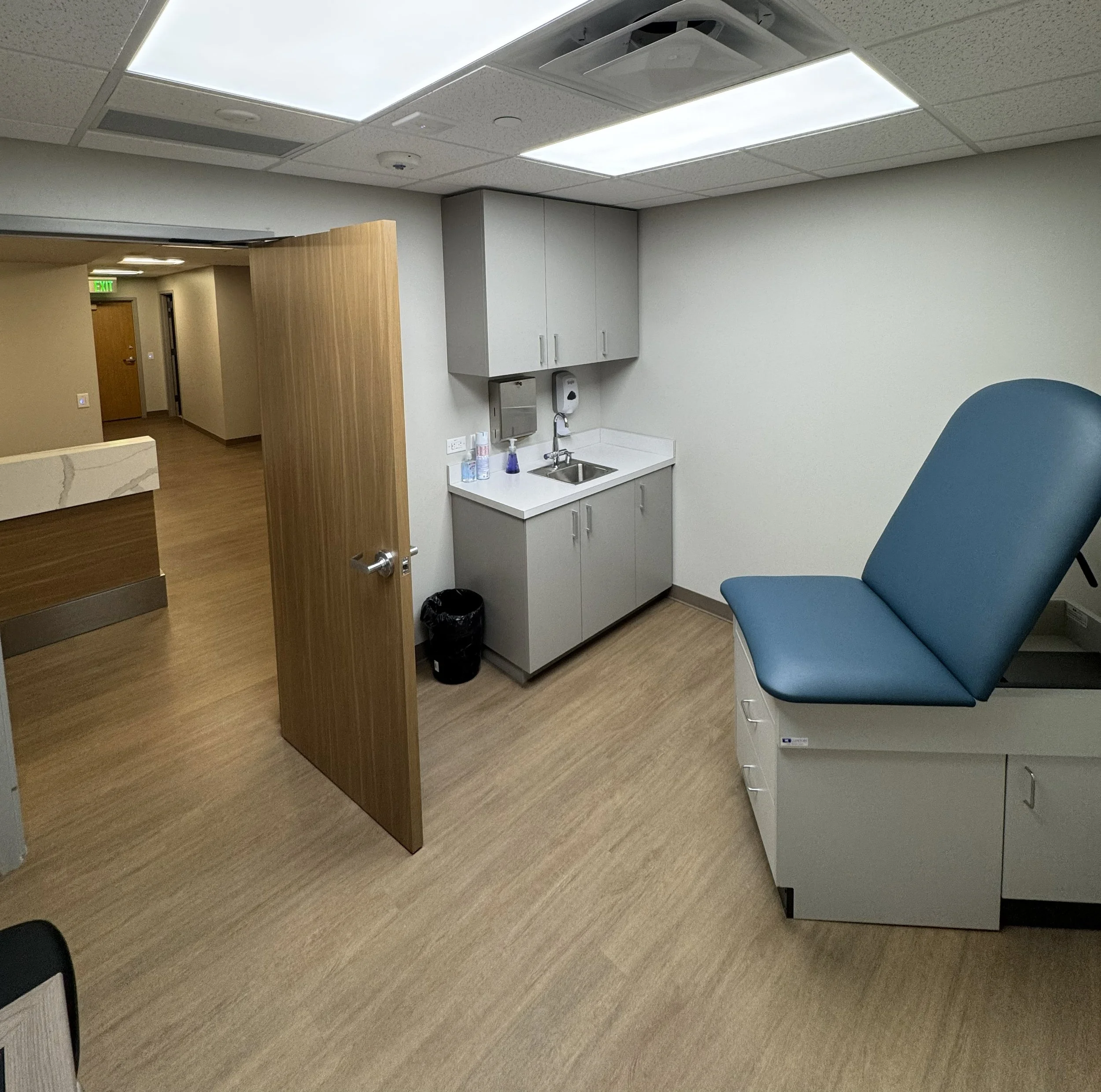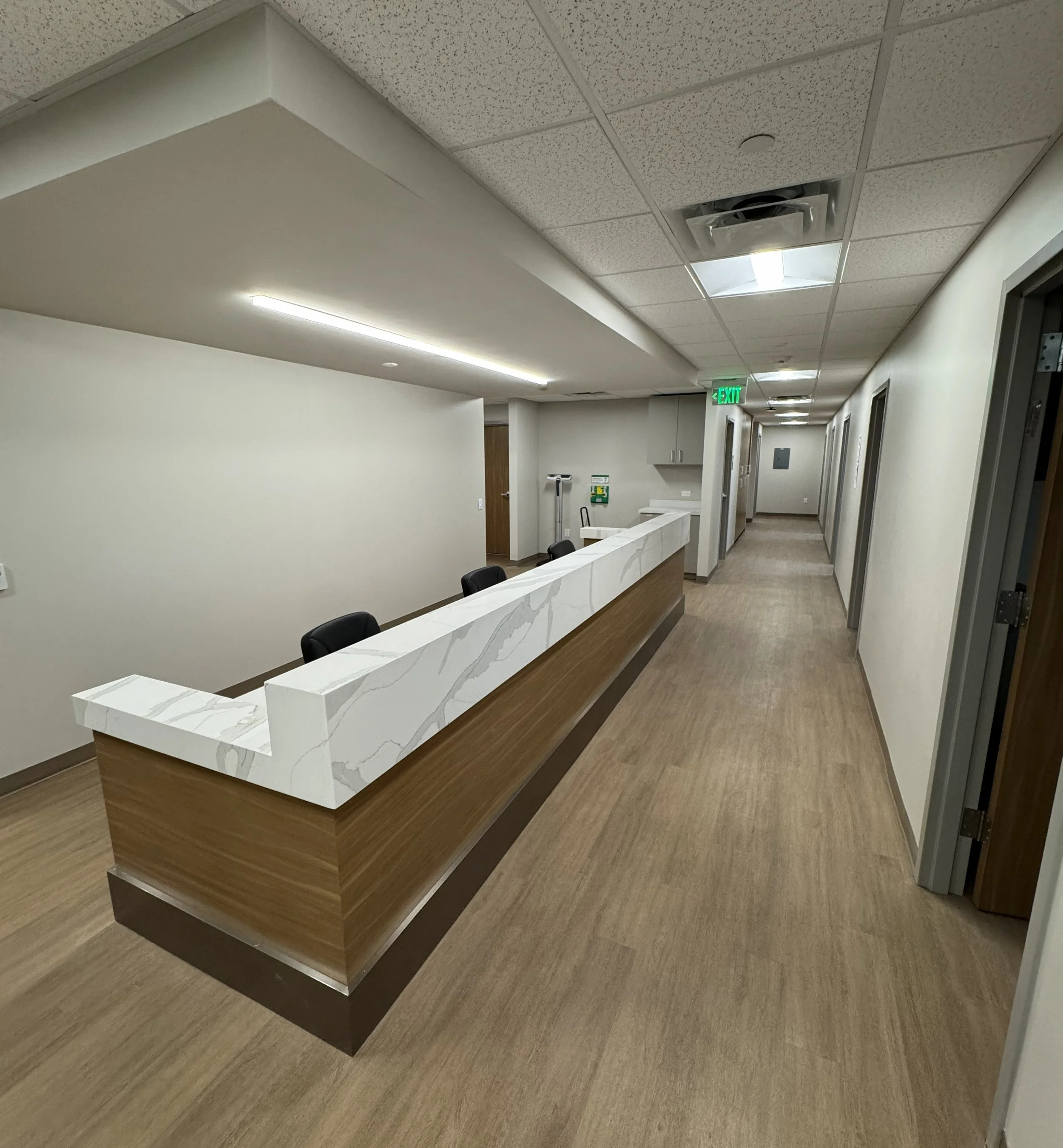 This 3,500-square-foot medical office renovation involved the complete demolition of two existing suites and their consolidation into a single, fully integrated clinical space. The project scope included the construction of six new exam rooms, two private offices, a procedure room, a laboratory, a staff breakroom, and two restrooms.